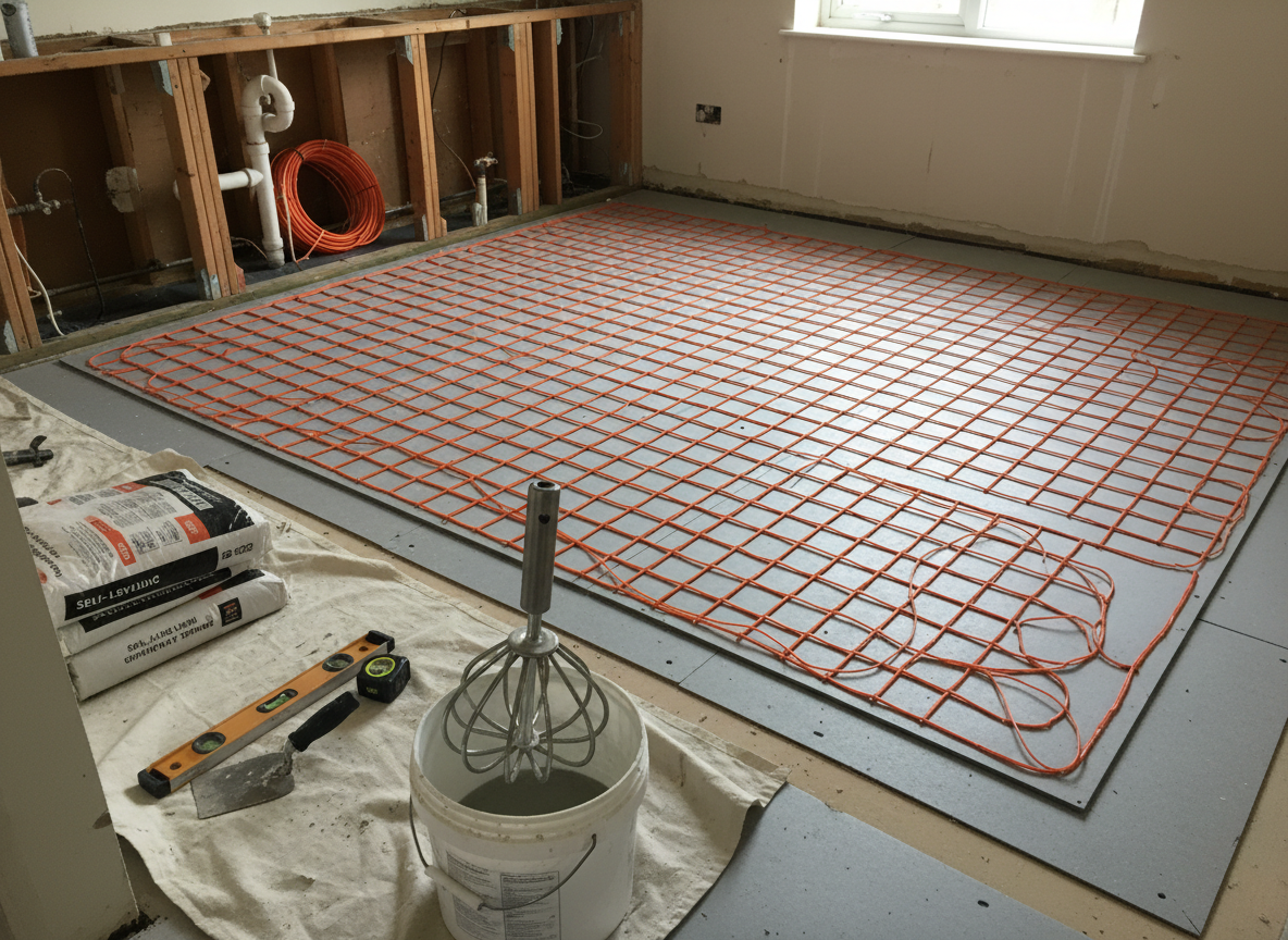 We fit the heating mat/cable system neatly and safely, ready for the next stages.